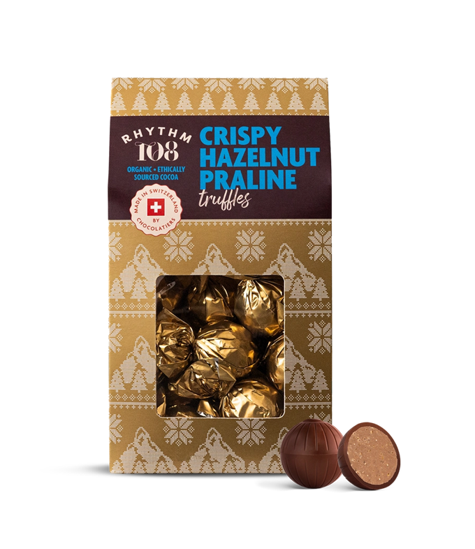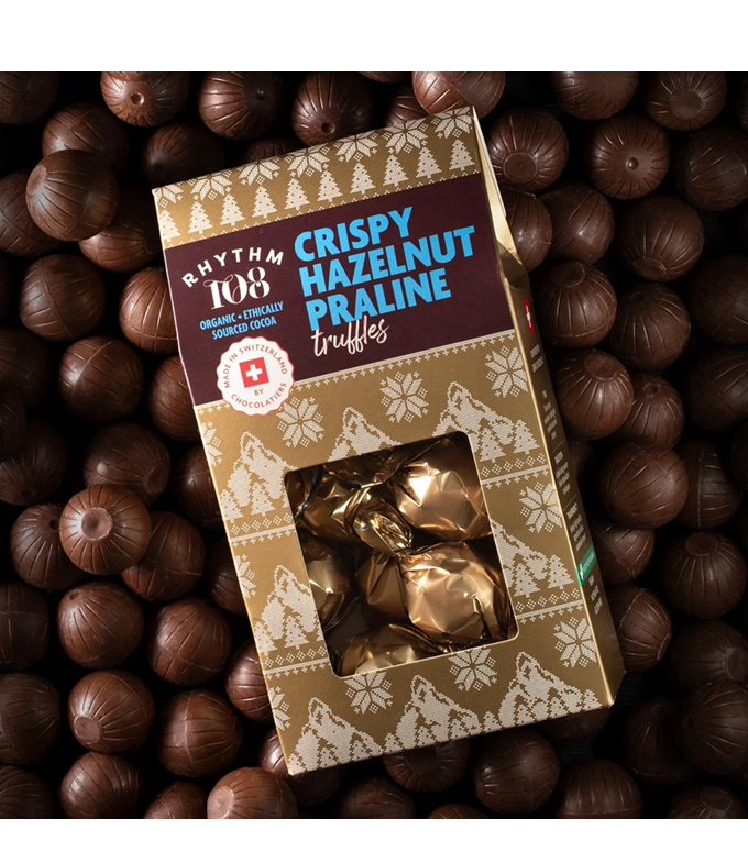 Rhythm108:n superherkulliset hasselpähkinäsuklaatryffelit juhlavassa pakkauksessa sopivat täydellisesti vaikkapa lahjaksi suklaanystävälle!